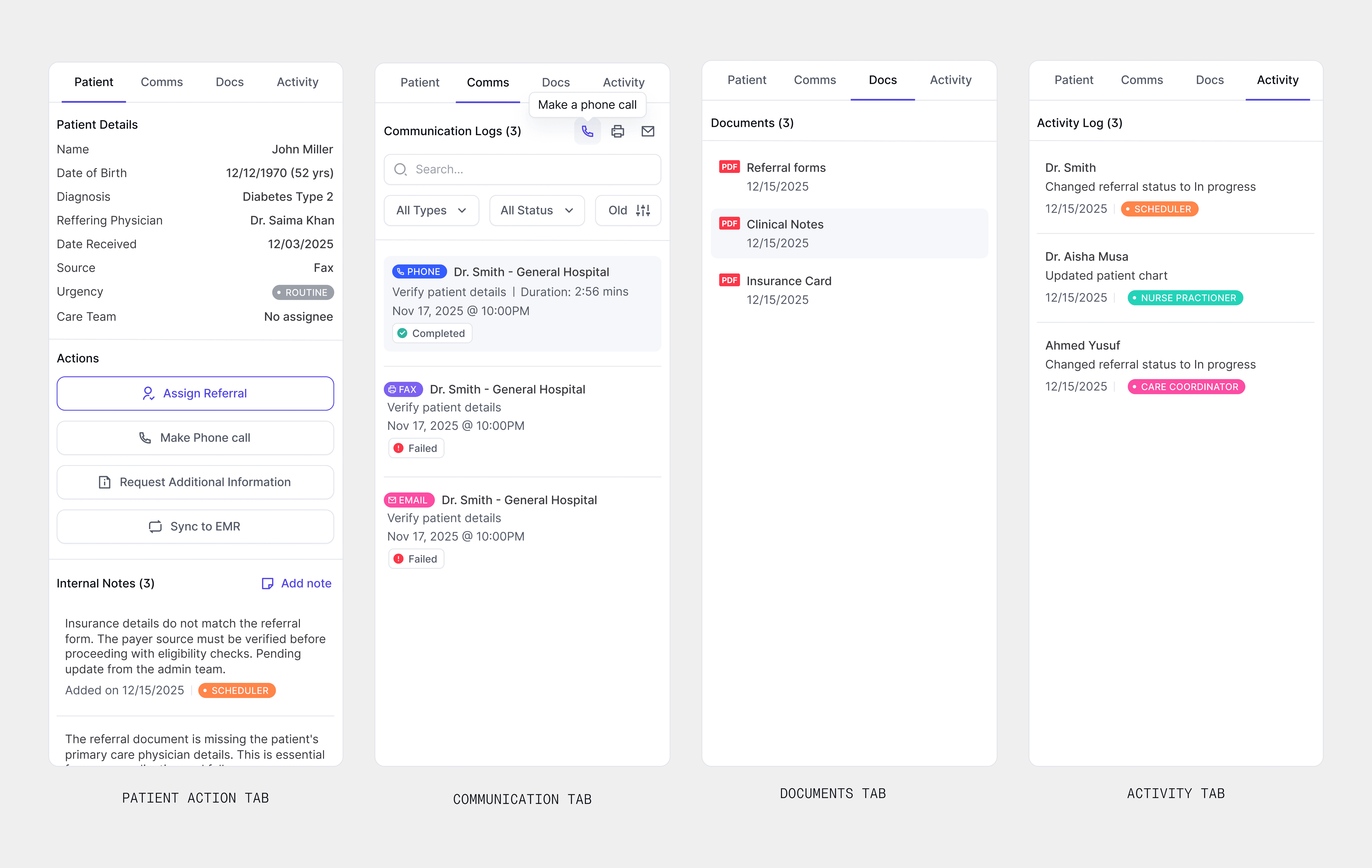 One of the earliest design challenges was figuring out how to present dozens of incoming documents without overwhelming users. I worked with our ML team to surface classification results directly into the inbox so instead of just filenames, users see each document pre-labeled by the agent: Referral, Payor Doc, or Needs Review.